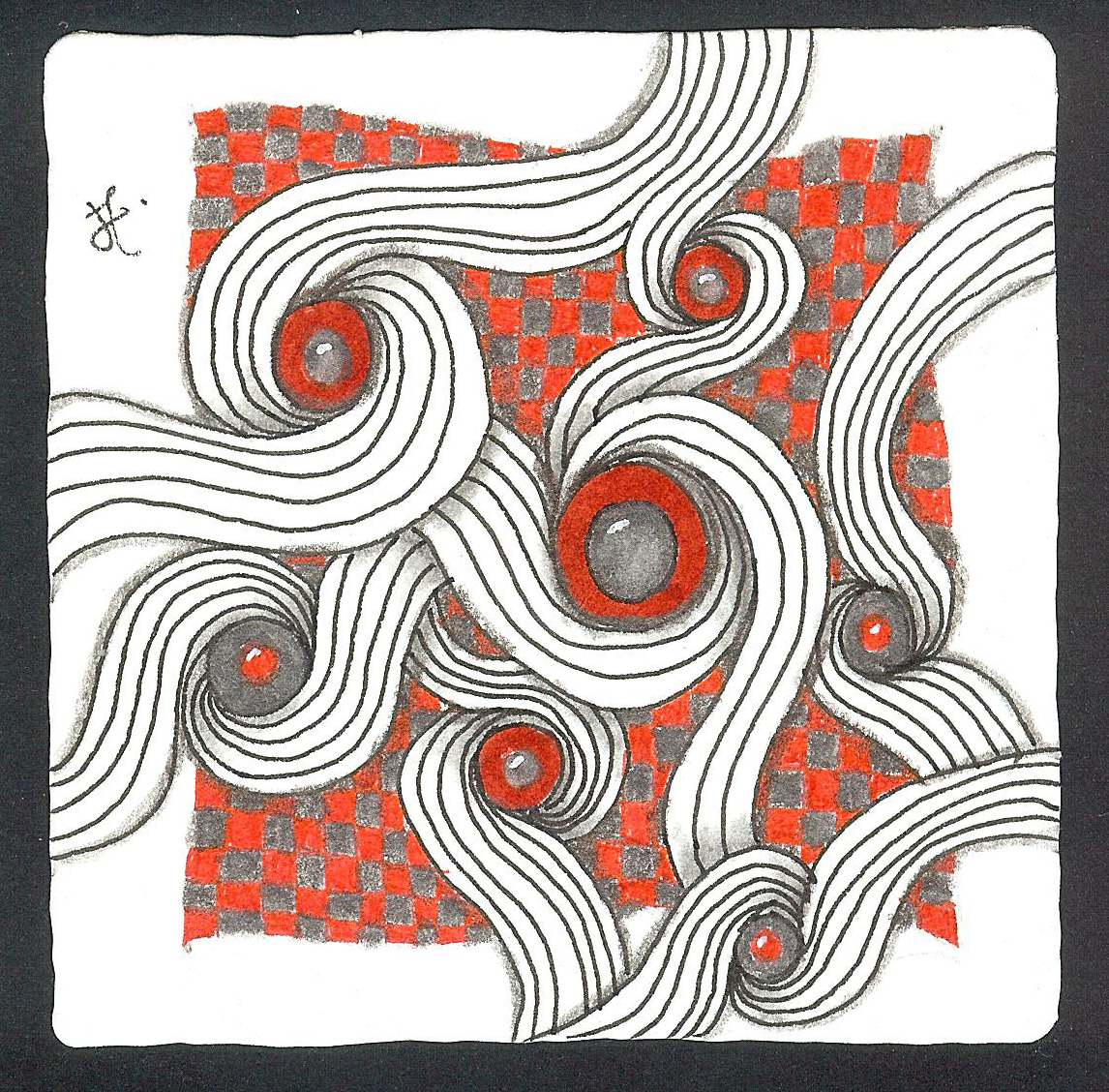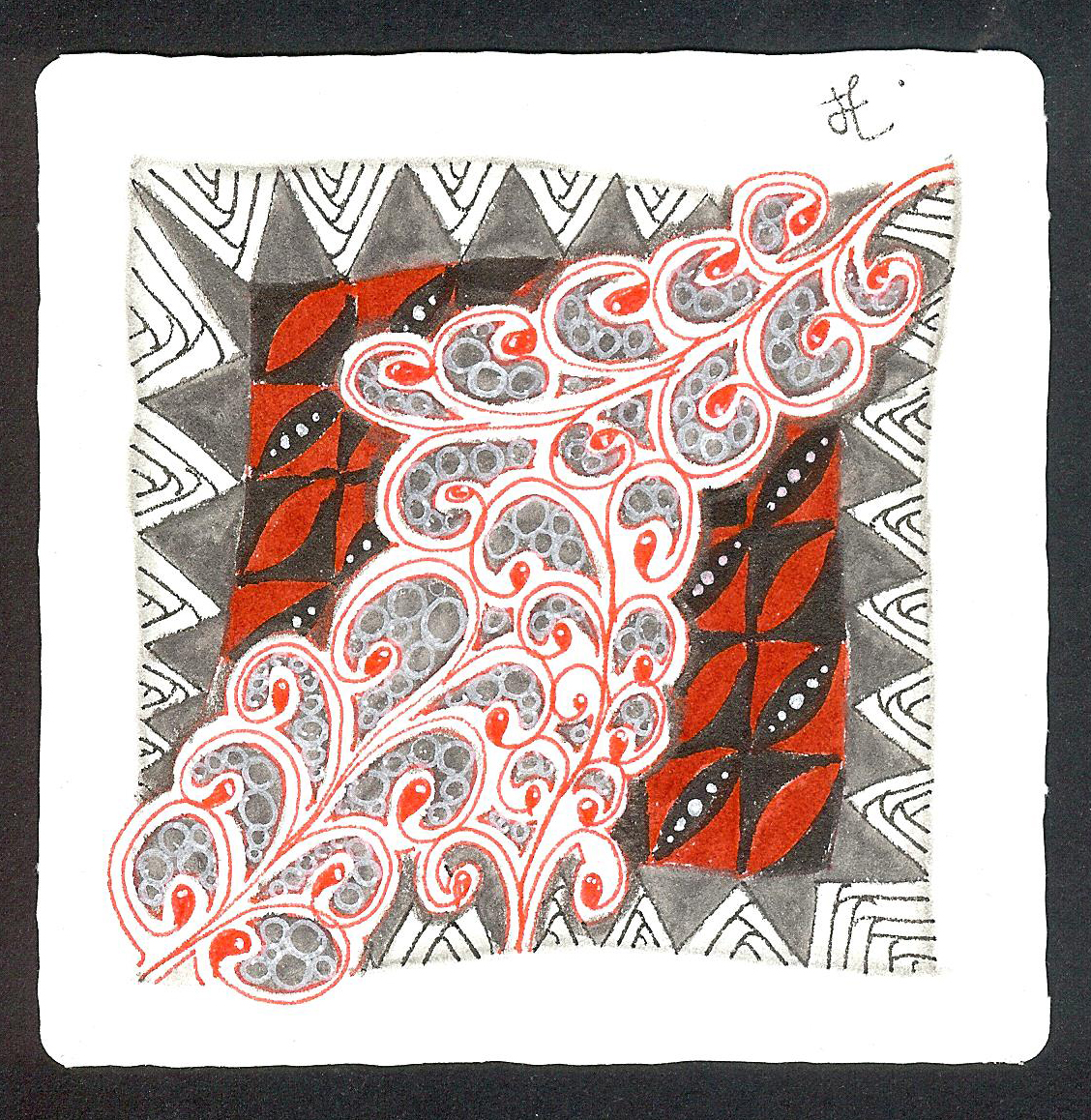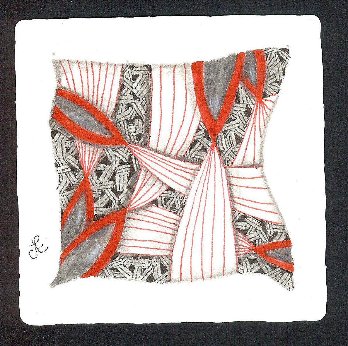 Until recently, I only ever used my red Micron for step-outs. Once some neighborhood kids wer visiting while I was playing around in my sketchbook and they wanted to know what I was doing, so we paged through it together. I noticed they particularly liked the step-outs. They would stop and point and say, „I like that one!“ It took me awhile to realize that it was the addition of color that they particularly liked. Anyway, I recently decided to try using my red Micron for „real“ tangling, and I liked it a lot! I especially like the the red Looks next to the gray of the pencil.