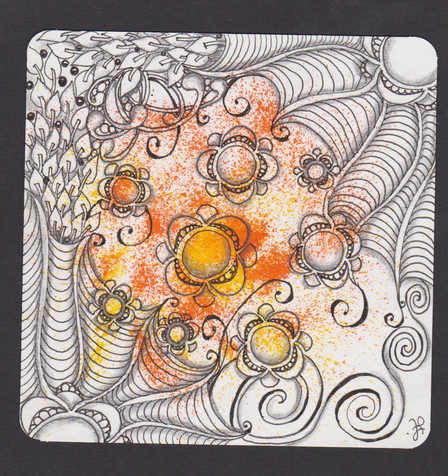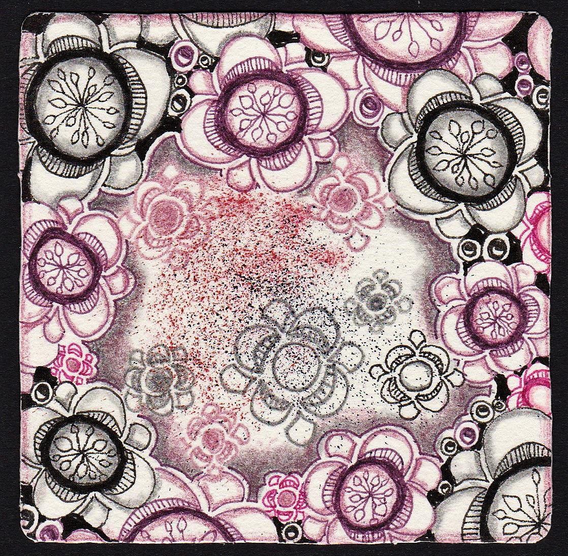 As I considered my first tile, Bloosa immediately came to mind. Bloosa is one of Diana Linsse’s patterns in her book Zentangle: Der Ultimative Kurs, which I don’t think is available in English. But I loved the way she used it in her book and I quickly saw how I could also use it on my first sprayed-ink tile.