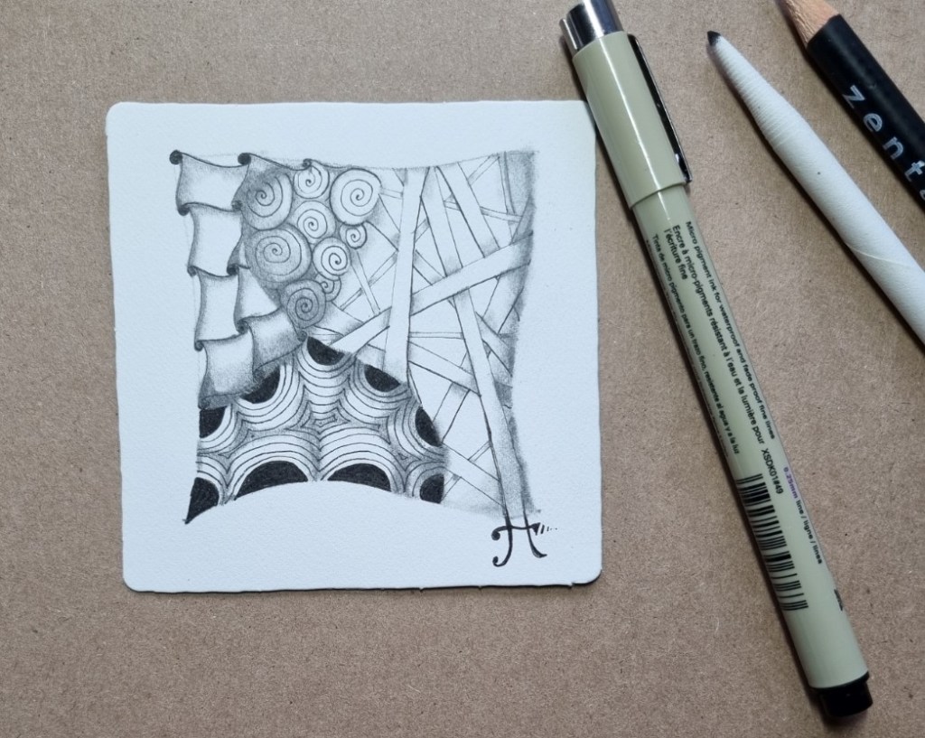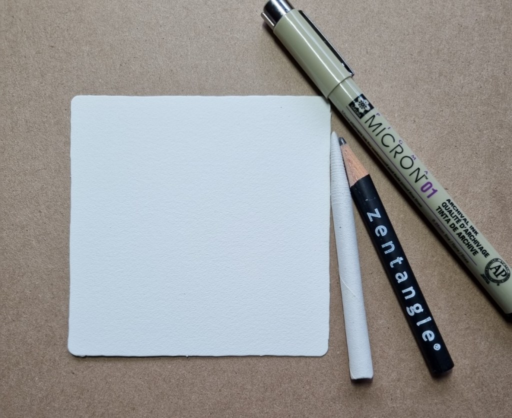 The Zentangle Method does not require a lot of material: a black fineliner, a pencil, a tortillon and a 9×9 cm square of thicker paper (also called a tile).