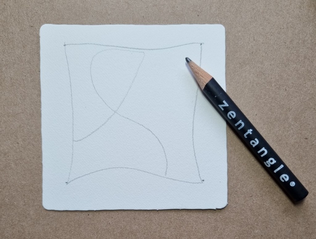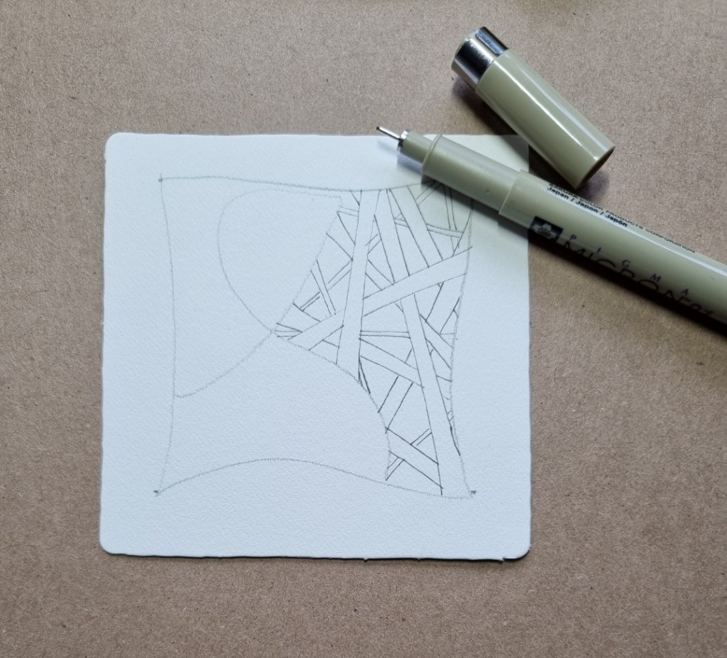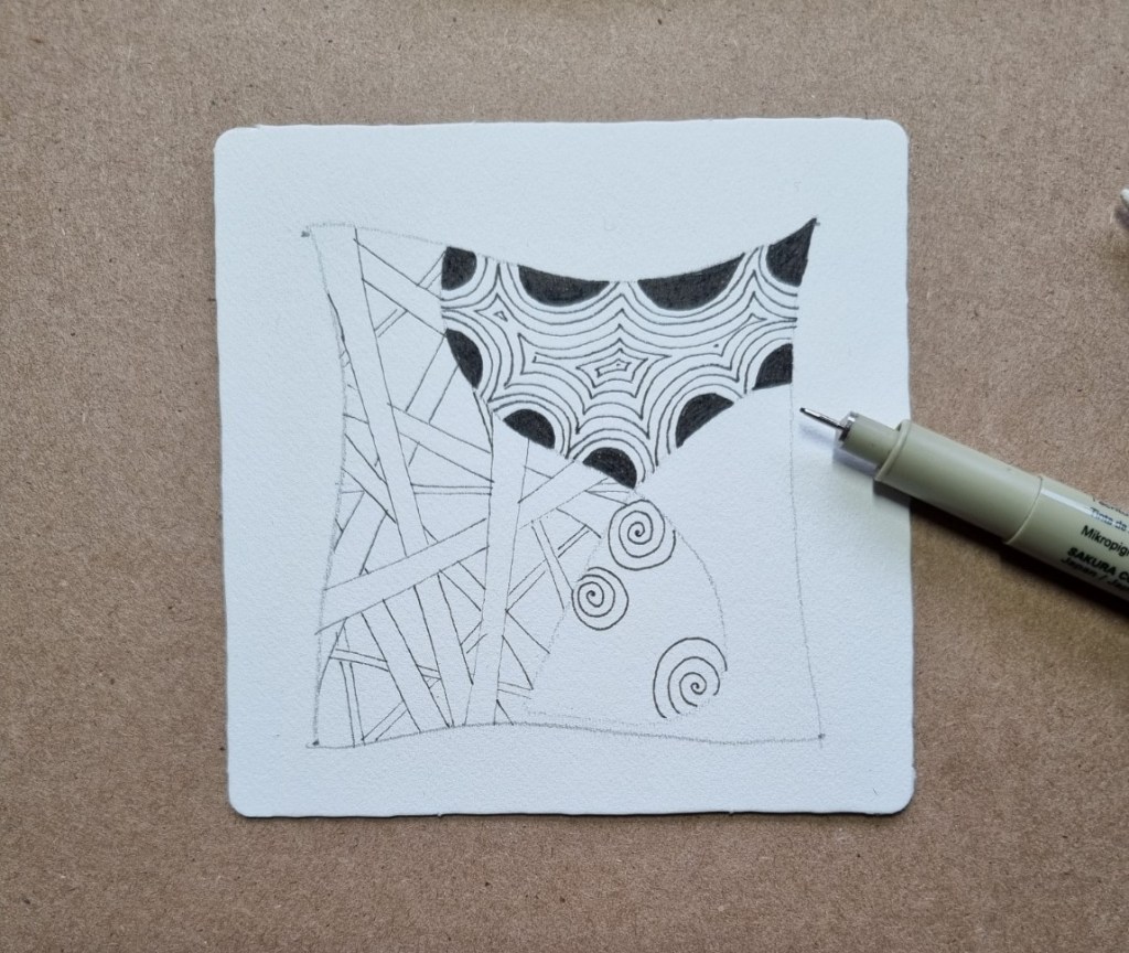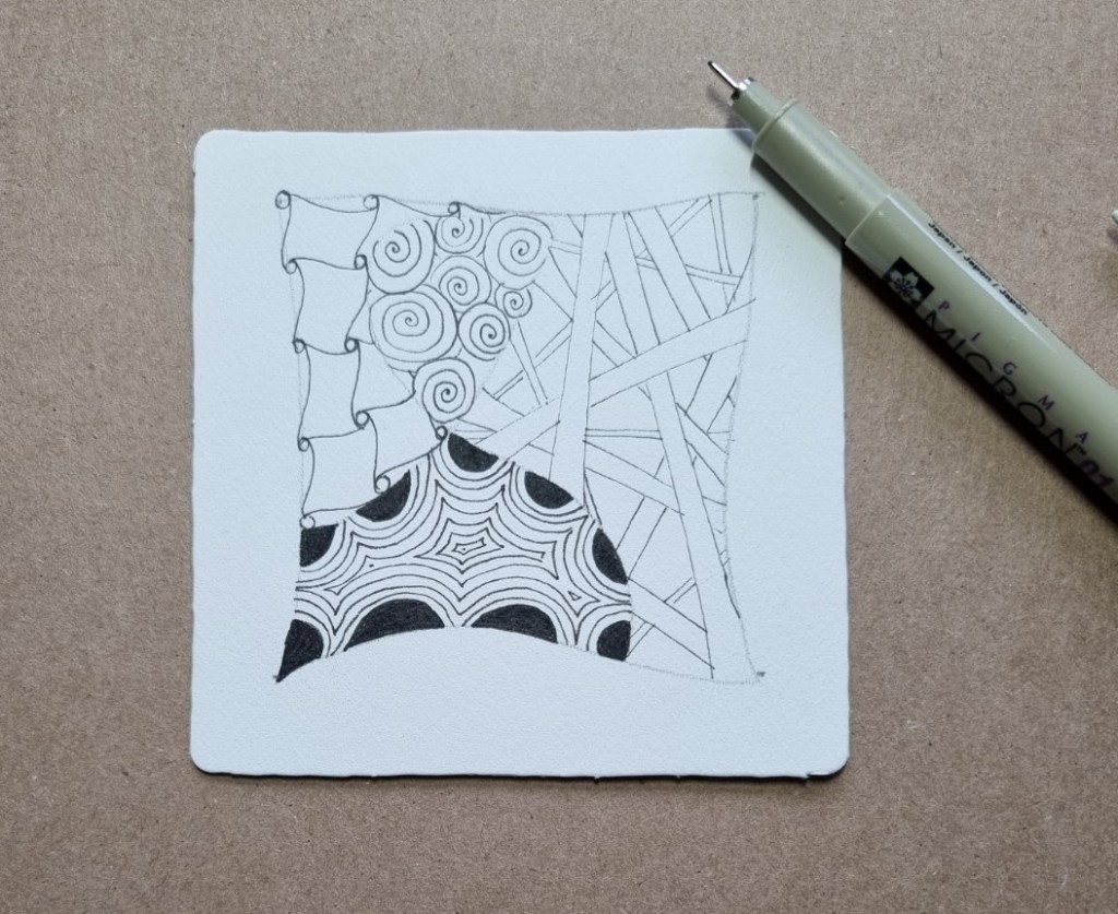 In this example, one pattern fills each space. Of course, you can also leave spaces blank, or combine spaces, or play with the string in any other way you fancy. While drawing, turn your tile to make the drawing easier.