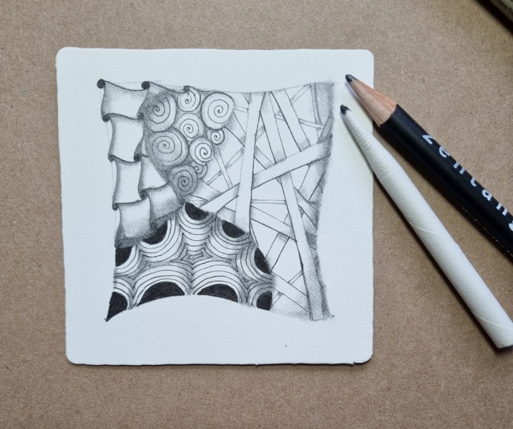 Mit dem Bleistift und Papierwische fügt man Schattierungen hinzu. Manche Zentangle-Kunstwerk (wie diese hier) wird erst dann wirklich interessant.